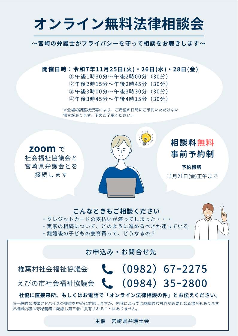 「オンライン無料法律相談会」を開催します。<11/25・11/26・11/28、えびの市・椎葉村で開催>