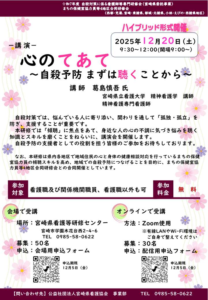 宮崎県看護協会では、宮崎県の自殺対策行動計画の一環として、毎年自殺予防研修会を開催しています。