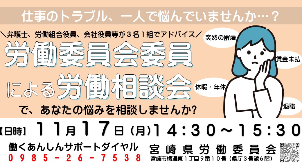 上記労働相談会以外でも、平日(午前8時30分~正午、午後1時~午後5時)は「働くあんしんサポートダイヤル(0985-26-7538)」にて事務局職員がご相談に応じております。
